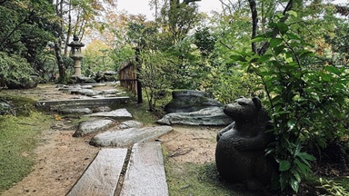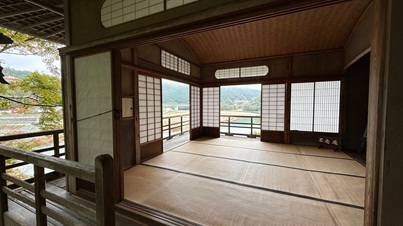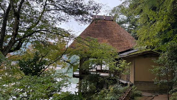 Diese 1907 erbaute Villa ist ein kleines Juwel mit einer Vielzahl von liebevollen Details, die wir eigenständig gar nicht entdeckt haben. So finden wir Garyû Sansô einfach pittoresk bis atmosphärisch, während Personen, welche sich mit den zugrundeliegenden Techniken der 9000! am Bau beteiligten Architekten, Handwerker und Künstler auskennen, schier vor Euphorie überschlagen. So ist hier praktisch jeder Bereich offiziell und separat als kulturelles Erbe von nationaler Bedeutung eingestuft. Da die Gebäude sich in den Garten und der Garten wiederum in die Landschaft einfügt, ist es leicht zu vermuten, wie sehr sich die Optik über die Jahreszeiten verändert. Aber bereits die Tageszeit ist hier Teil der Dekoration. Zur Verdeutlichung der zugrundeliegenden Raffinesse nur ein Beispiel. Es existiert eine gebogene Decke, deren Krümmung dazu dient, das Licht des Mondes zu spiegeln. Aber nicht direkt, sondern das Mondlicht fällt auf den, neben dem Gebäude verlaufenden Fluss und spielt sich dann in der Decke. Kein Wunder also, dass Enthusiasten die Villa immer wieder besuchen. Sonntags wird hier auch Tee serviert, zu unserem Leidwesen aber nur von April bis Oktober.